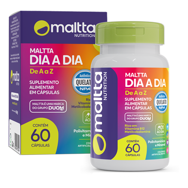 Maltta Dia a Dia é um polivitamínico e mineral, projetado para fornecer uma combinação de vitaminas e minerais essenciais para contribuir no bem-estar diário. Com uma formulação que abrange o complexo de vitaminas de A a Z, ele se destaca pelo alto teor de metilcobalamina, uma forma bioativa da vitamina B12 que contribui para a saúde neurológica e energética. Ideal para aqueles que buscam um suporte nutricional completo, o Duom Dia a Dia ajuda a manter a vitalidade e o equilíbrio, promovendo uma rotina mais saudável e ativa.